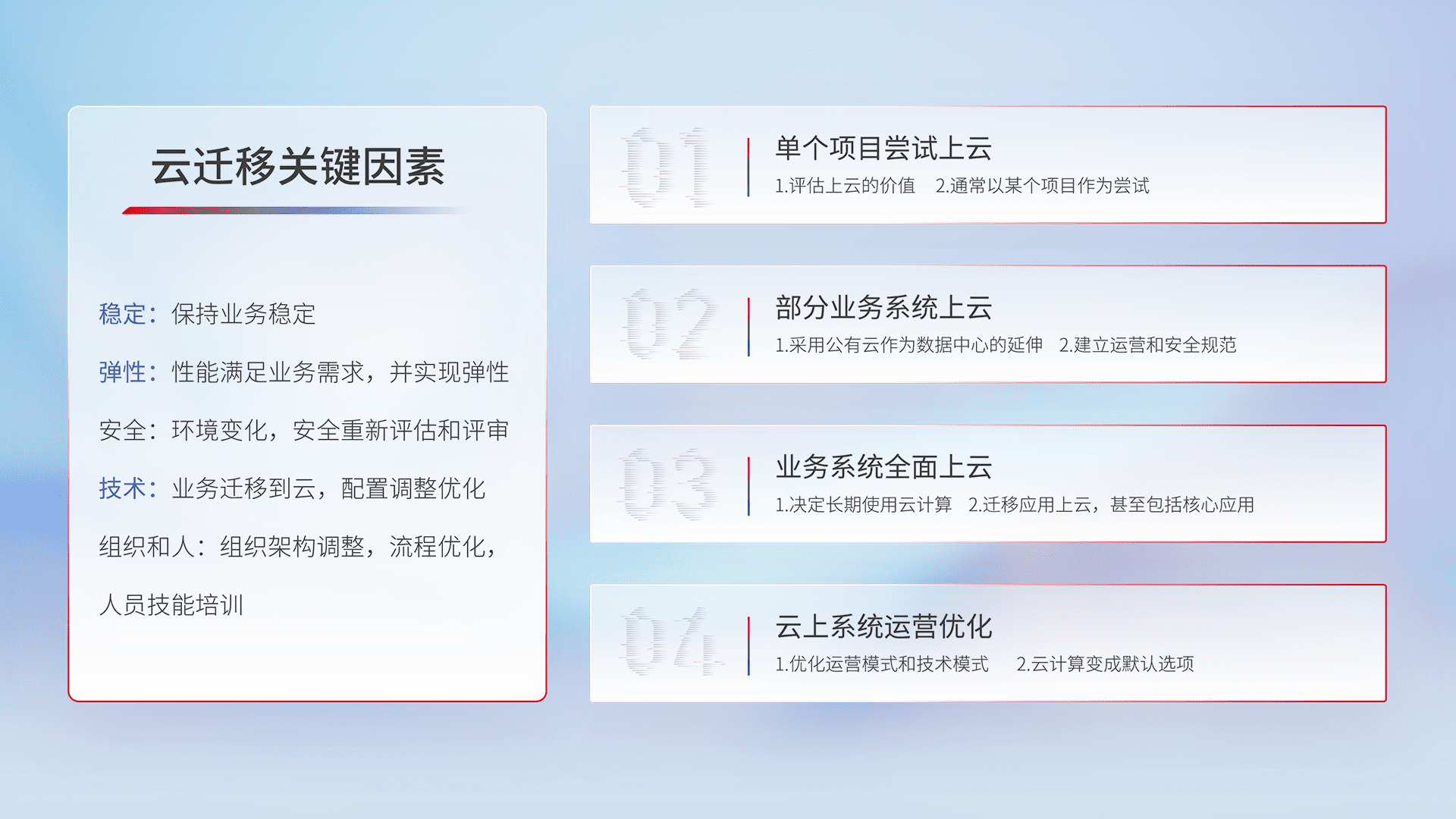 结合实际业务,,,,从规划设计、、、云平台选型、、、、云原生改造、、数据迁移、、、、集成交付,,,,迁移全过程为客户识别最佳上云路径,,做好风险识别管理,,,设计网络架构、、身份权限、、、安全审计合规、、、操作审计、、、日志审计、、监控告警策略、、、多站点容灾设计等,,,,对云上基础设施进行整体规划,,提升IT治理水平,,,,以满足弹性、、高可用、、高性能的需求。。。