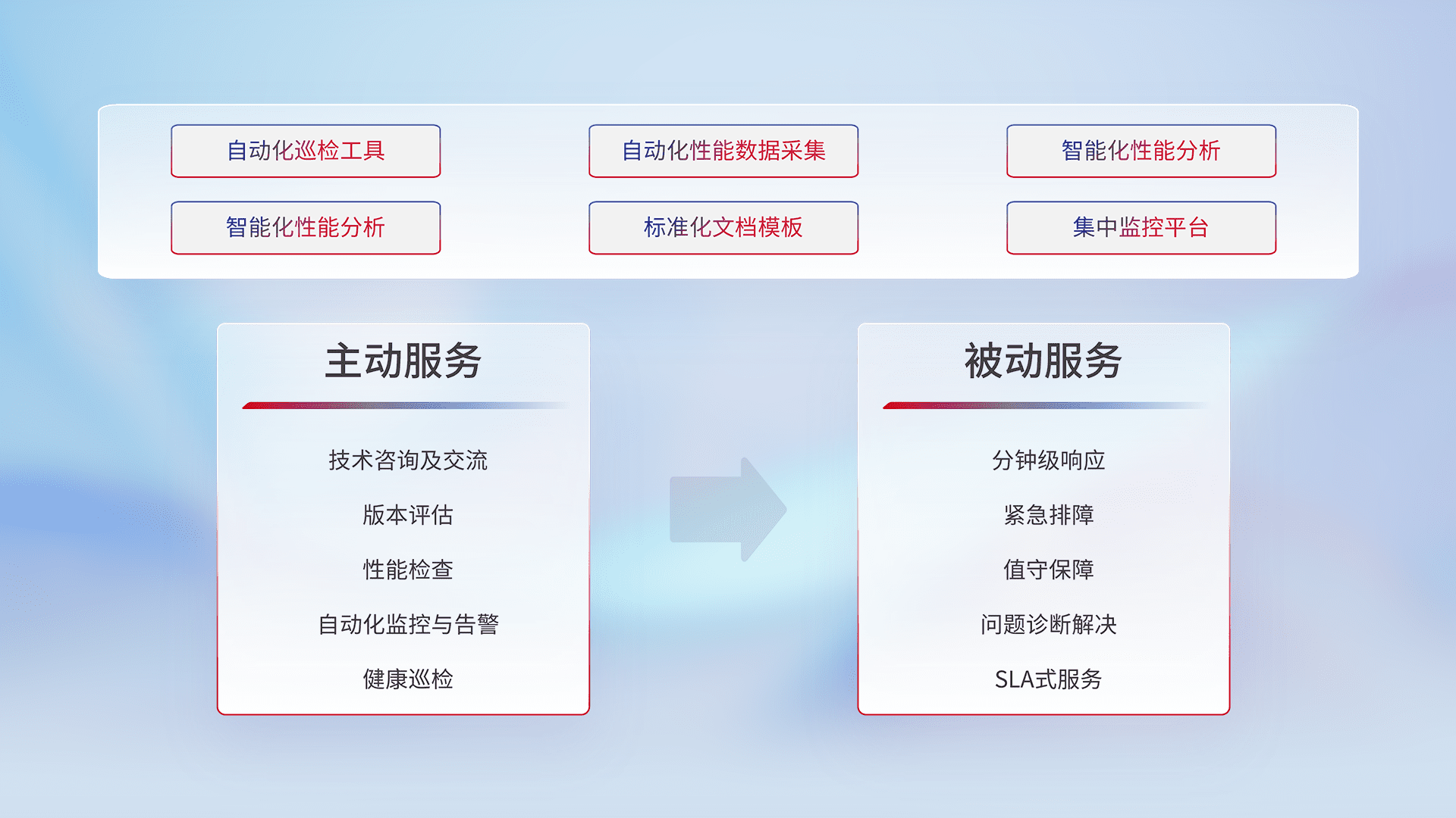 智能化工具和标准化文档,,,保障服务质量,,,,提供主动服务(包含技术咨询、、、版本评估、、、性能检查、、、自动化监控与告警、、、健康巡检)和被动服务包含(分钟级响应、、紧急排障、、、、值守保障、、、问题诊断解决、、、、SLA服务)。。